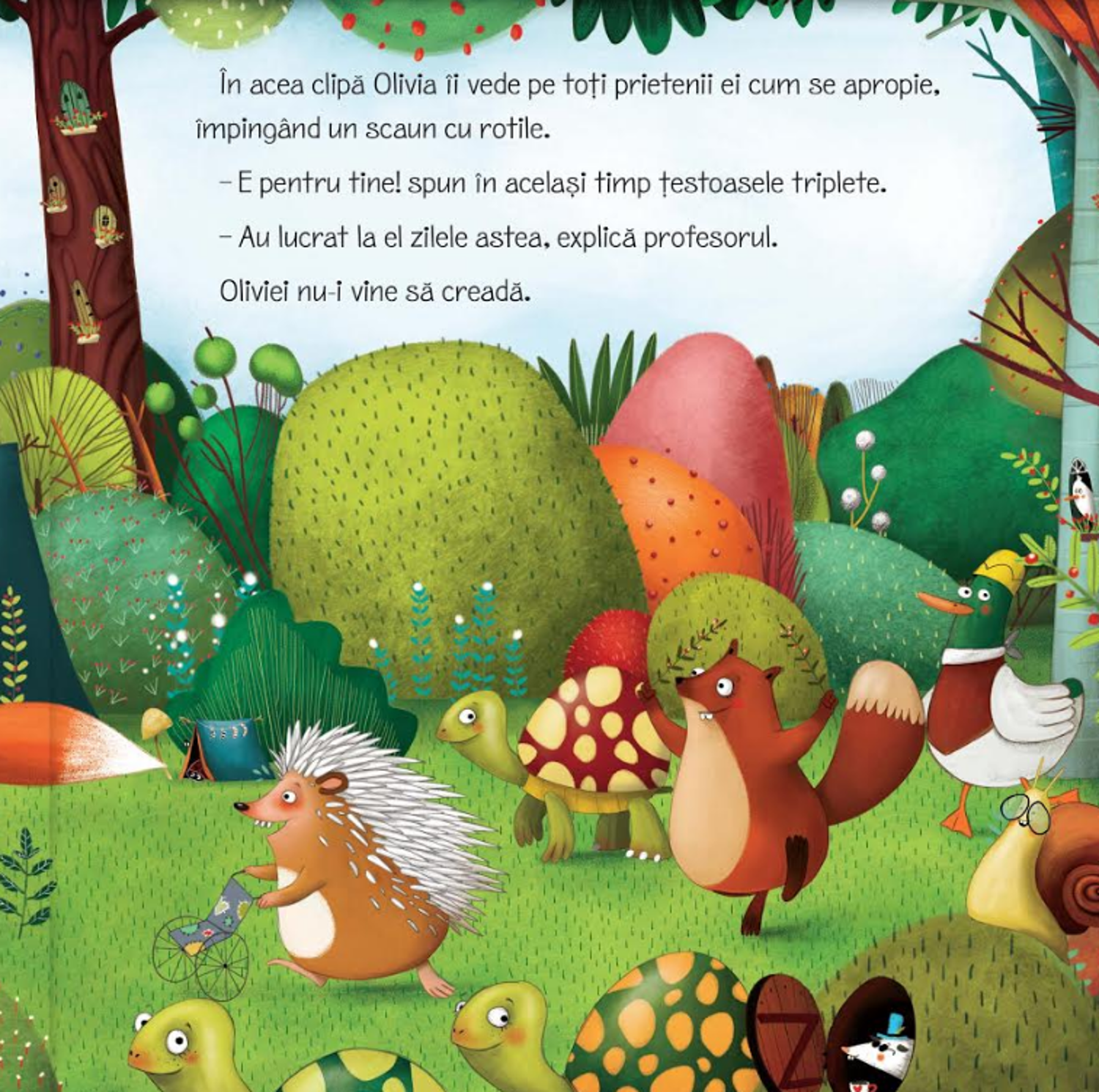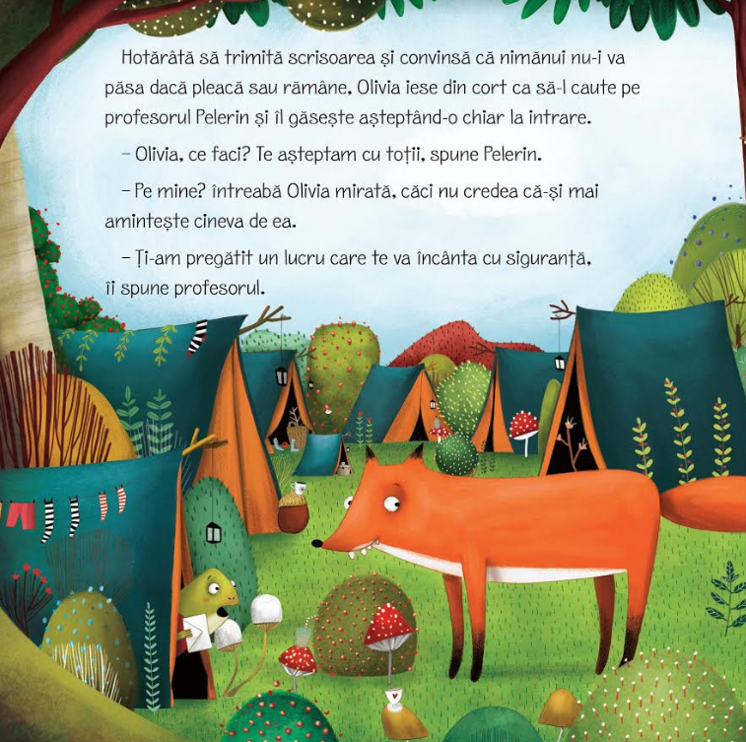 Pentru prietenii din padure, sosirea verii inseamna un singur lucru: pleaca in tabara! Dar pentru Olivia nu e vacanta la care se astepta: si-a rupt piciorul si nu se mai poate juca nimic. Prietenli ei se distreaza de minune… oare nu se gandesc deloc la ea? Si totusi, Olivia nu este singura, asa cum va descoperi curand. Te poti simti singur chiar daca esti inconjurat de lume, asa cum te poti simti aproape de cei dragi chiar si in singuratate. lubirea nu tine cont de distanta.