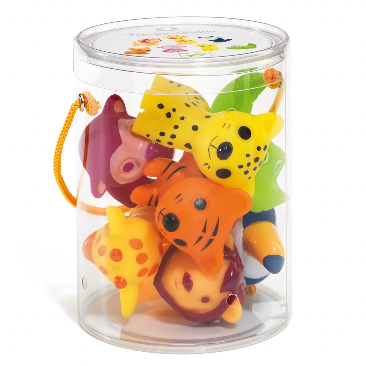 Animăluțe din silicon Troopo savana 7 animăluțe prietenoase, de culori diferite, din silicon non alergic. Tovarăși buni de joacă și la băiță. Materialul moale este confortabil de manevrat pentru mâinile mici. Vârsta recomandată: +18 luni. AVERTISMENT: Contraindicat copiilor sub 18 luni. A se folosi sub directa supraveghere a unei persoane adulte. Înlăturați ambalajul înainte de a oferi jucăriile copilului. Producător: Djeco, Franța.