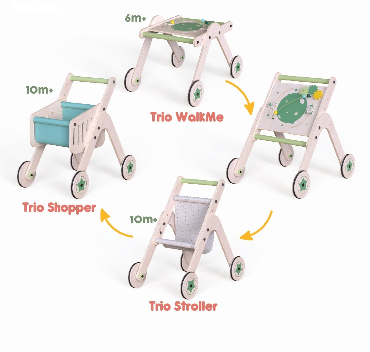 Functii multiple: este o combinatie de mai multe jucarii avand mai multe functii: premergator, masuta de activitati, carucior de papausi sau carucior de cumparaturi cu mai multe jocuri printre care margele pe sarma, roti dintate care se invart sau primele notiuni despre spatiu si rachete.