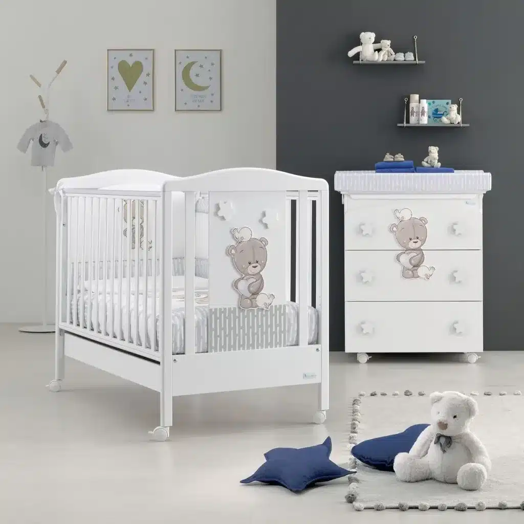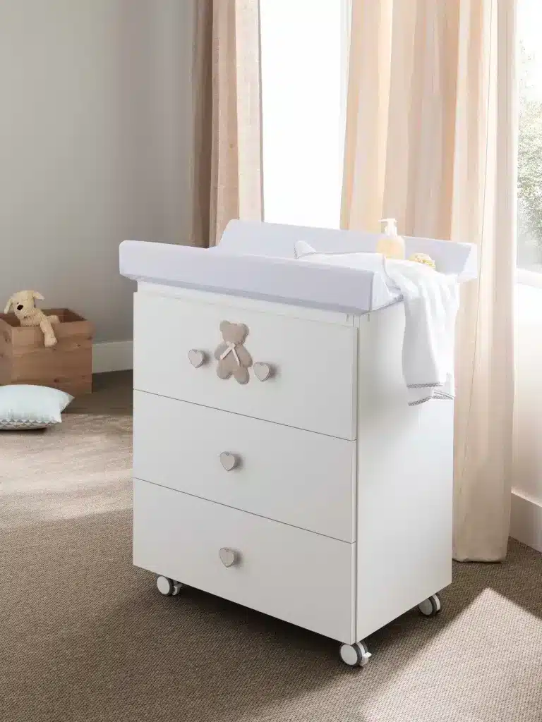 Comoda Bebe multifunctionala cu 4 sertare, salteluta pentru infasat, cadita incorporata și roti cu frâne.Include in pret: saltea de infasat moale 50 * 80 cm cu fixare pe comoda. Saltea detașabilă butoni de prindere sertar cadita pentru baita lui bebe, ergonomica cu scurgere care va usura manevrele de golire a acesteia. Cădiță este detașabilă si ea 4 roti pentru deplasarea usoara a acesteia prin camera atunci cand se doreste, 2 dintre acestea au sistem de blocare. Ulterior atat salteaua de infasat cat si cada pot fi inlaturate transformand, astfel comoda intr-una pentru juniori.dimensiuni exterioare76 * 49 * 91cm Separat se poate cumpara husa din bumbac pentru salteluta de infasat. Comoda Bebe fabricata in Italia.