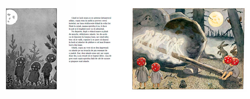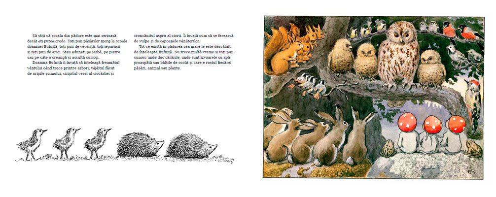 Chiar dacă nu i-a văzut nimeni până acum, în păduri trăiesc, fără îndoială, alături de zâne, și numeroase familii de spiriduși. Așa se spune în povești. Iar spiridușii, firește, au și ei copii. Ce fac ei toată ziua? Aleargă, se ascund, sar, strigă, se joacă în apă sau cu pietre și bețe — dar se duc și la școala din pădure, alături de toți puii de animale, își ajută părinții la strânsul proviziilor pentru la iarnă, se ajută între ei sau pe alte viețuitoare. După care aleargă, se ascund, sar, strigă…