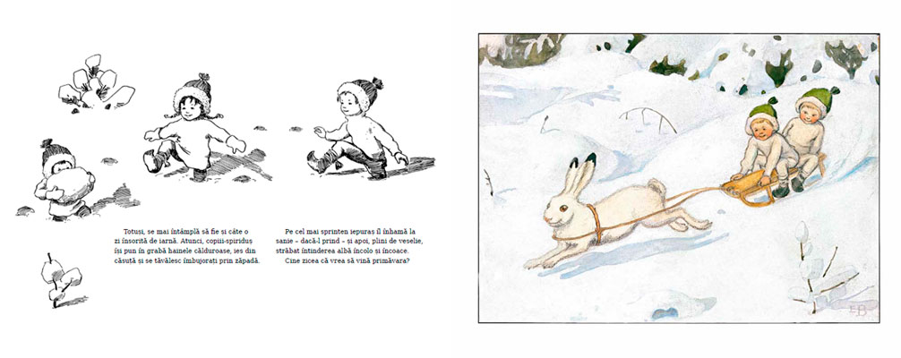 Primăvara, copiii-spiriduș sunt atât de bucuroși și de zburdalnici încât mamei îi este peste putință să-i țină acasă. Se bălăcesc prin pâraie, construiesc baraje din bolovani sau mori de apă din bețe, aleargă și sar de colo-colo cât e ziulica de lungă. Chiar dacă sunt uzi leoarcă din cap până-n picioare, nimeni nu-i ceartă. Și nici vorbă să răcească. Este nemaipomenit să fii un mic spiriduș!