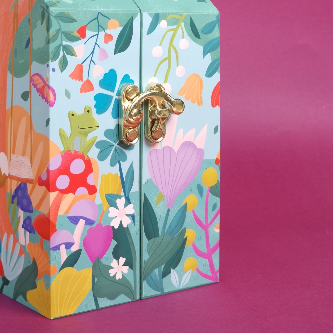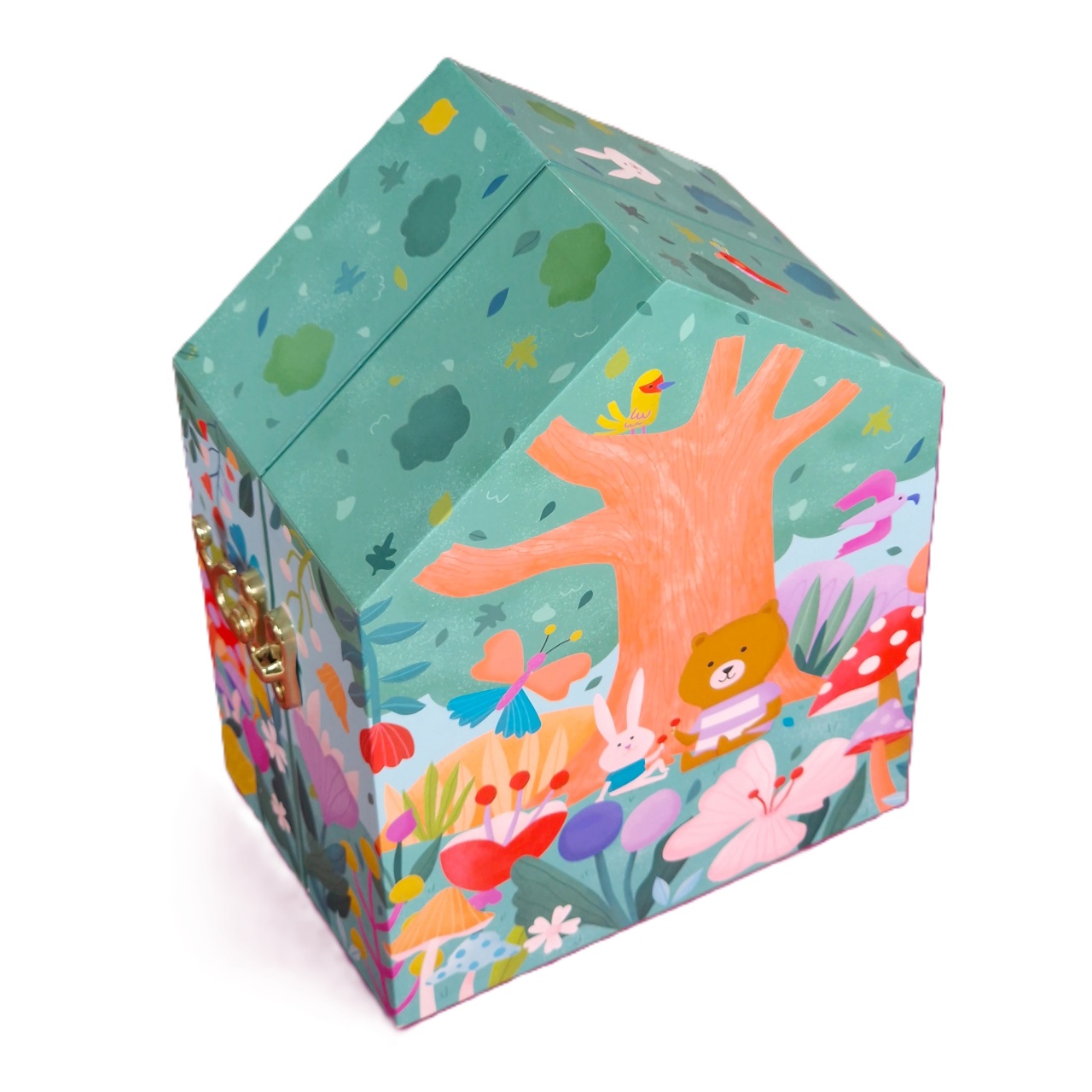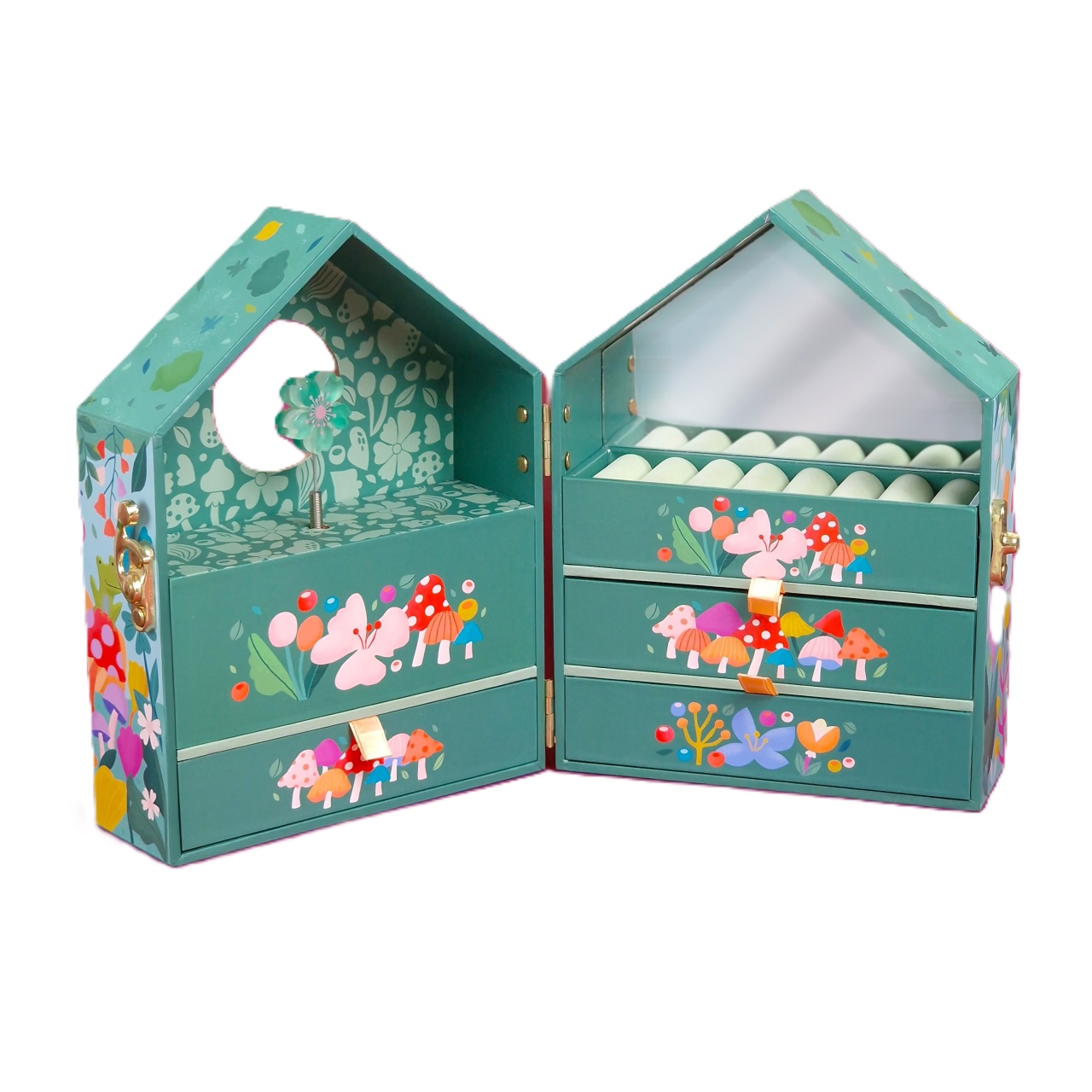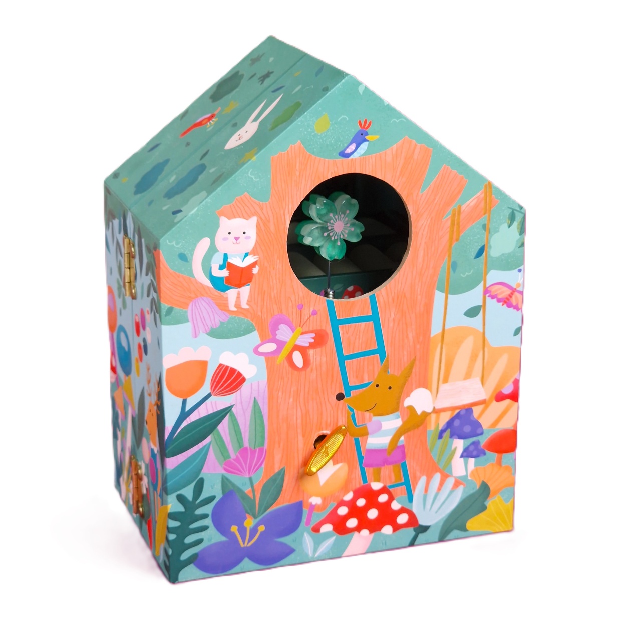 Cutie de bijuterii muzicala Casuta din copac O cutie de bijuterii care aduce farmec și nostalgie în camera ta. Se deschide larg pentru a dezvălui o oglindă, rafturi și suport pentru inele, oferind un spațiu organizat pentru bijuterii și mici comori. În plus, mecanismul muzical redă o melodie blândă care adaugă o notă de poveste fiecărei deschideri. Realizată cu atenție la detalii – culori pastelate, mici ferestre decorative – această cutie e nu doar un obiect util, ci și un element de decor fermecător pentru camera copilului sau pentru un cadou special. Melodie: Beautiful DreamerDimensiune cutie muzicală: 20 × 15 × 10 cmVârsta recomandată: +4 ani. Confecționată din velur, MDF, balamale metalice, mecanism pentru cutie muzicală. AVERTISMENT: Articol decorativ. Nu este jucărie. A nu se lăsa la îndemâna copiilor sub 3 ani.Producător: Svoora
