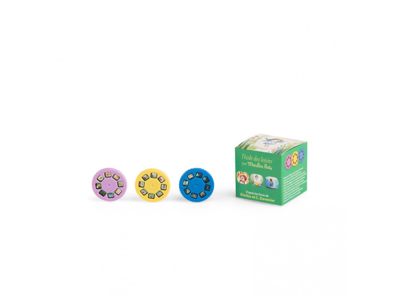 Rezerve pentru lanternă cu poveşti Conține 3 discuri cu ”diapozitive”, fiecare conținând 8 imagini cu povești din colecția Ecole de loisirs. Distrează-te inventând o lume de basme împreună cu copilul tău. Compatibile cu orice model de lanternă Moulin Roty. Dimensiuni: 4.5 x 4.5 x 4.5 cm Vârsta recomandată: + 4 ani.Confecţionate din plastic, conform reglementarilor EN71&ASTM. AVERTISMENT! Contraindicat copiilor sub 3 ani, conţine piese mici, pericol de înghițire. A se folosi sub directa supraveghere a unei persoane adulte. Citiţi cu atenţie eticheta înainte de a înmâna jucăria copilului.Producător: Moulin Roty, Franța.