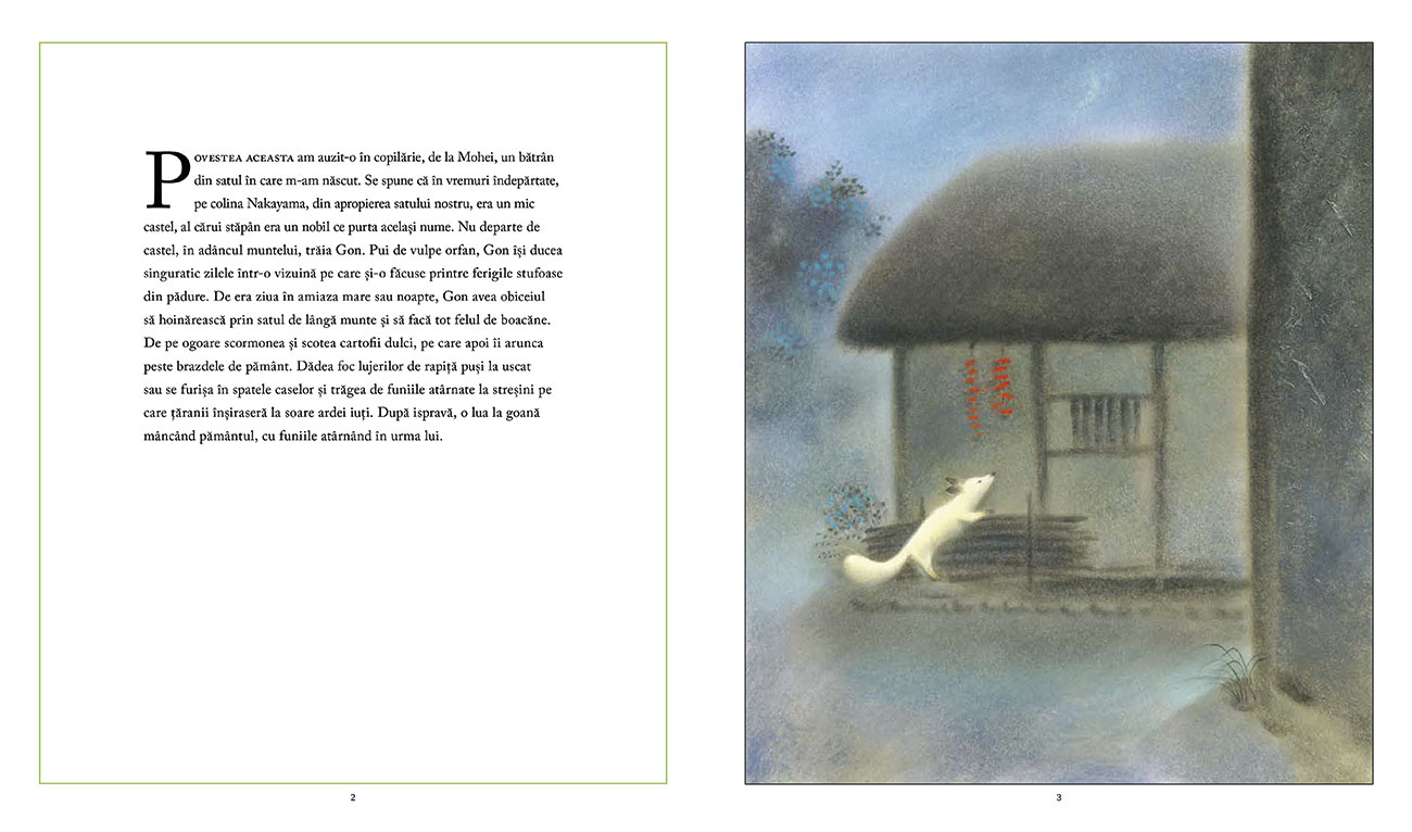 Povestea aceasta am auzit-o în copilărie, de la Mohei, un bătrân din satul în care m-am născut. Se spune că în vremuri îndepărtate, pe colina Nakayama, din apropierea satului nostru, era un mic castel, al cărui stăpân era un nobil ce purta același nume. Nu departe de castel, în adâncul muntelui, trăia Gon. Pui de vulpe orfan, Gon își ducea singuratic zilele într-o vizuină pe care și-o făcuse printre ferigile stufoase din pădure. De era ziua în amiaza mare sau noapte, Gon avea obiceiul să hoinărească prin satul de lângă munte și să facă tot felul de boacăne.