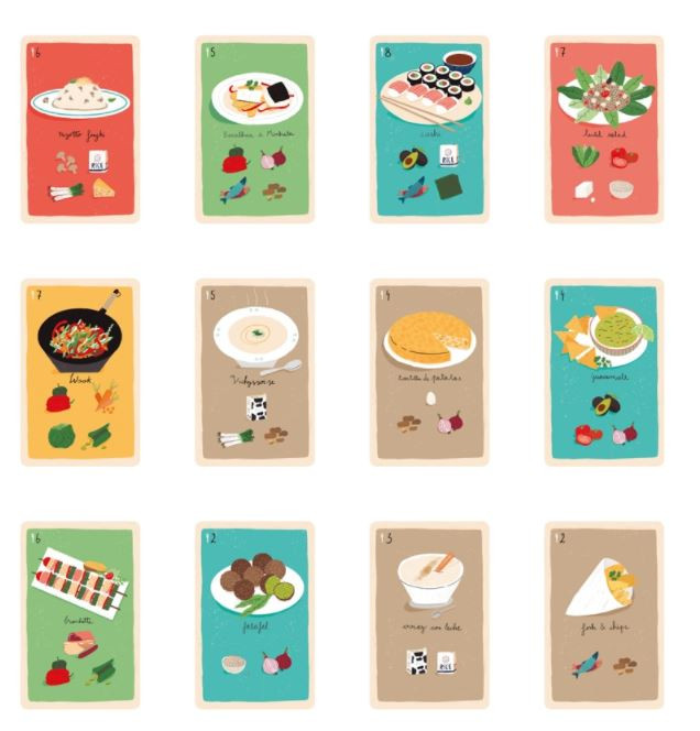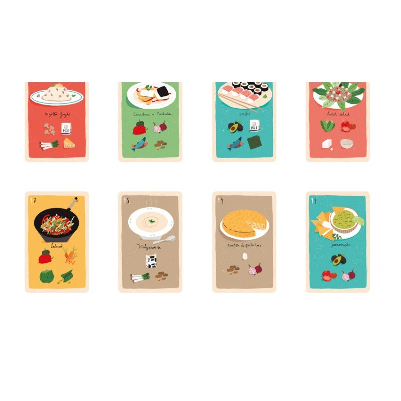 Joc de cărți În bucătărie – gătim strategic A fost odată …. un bucătar care a încurcat ingredientele necesare pentru a găti rețetele din meniu. Ajută-l să găsească legumele, peștele, pastele, tot ce are nevoie cât mai repede pentru că sosesc invitații! Un joc distractiv în care viteza și alegerea celei mai bune opțiuni vor fi recompensate! Jucătorul care reușește să completeze cele mai multe rețete câștigă jocul. Stimulează concentrarea și memoria. Pentru a fi câștigător trebuie să alegeți cea mai bună strategie. Jocul conţine 80 de cărţi cartonate. Pentru 3-6 jucători. Vârsta recomandată: +7 ani. Confecționat din fartie FSC si carton reciclat. Conform reglementărilor EN71&ASTM. AVERTISMENT! Contraindicat copiilor sub 3 ani. A se folosi sub directa supraveghere a unei persoane adulte. Producător: Londji, Spania. Ilustrat de Can Seixanta.