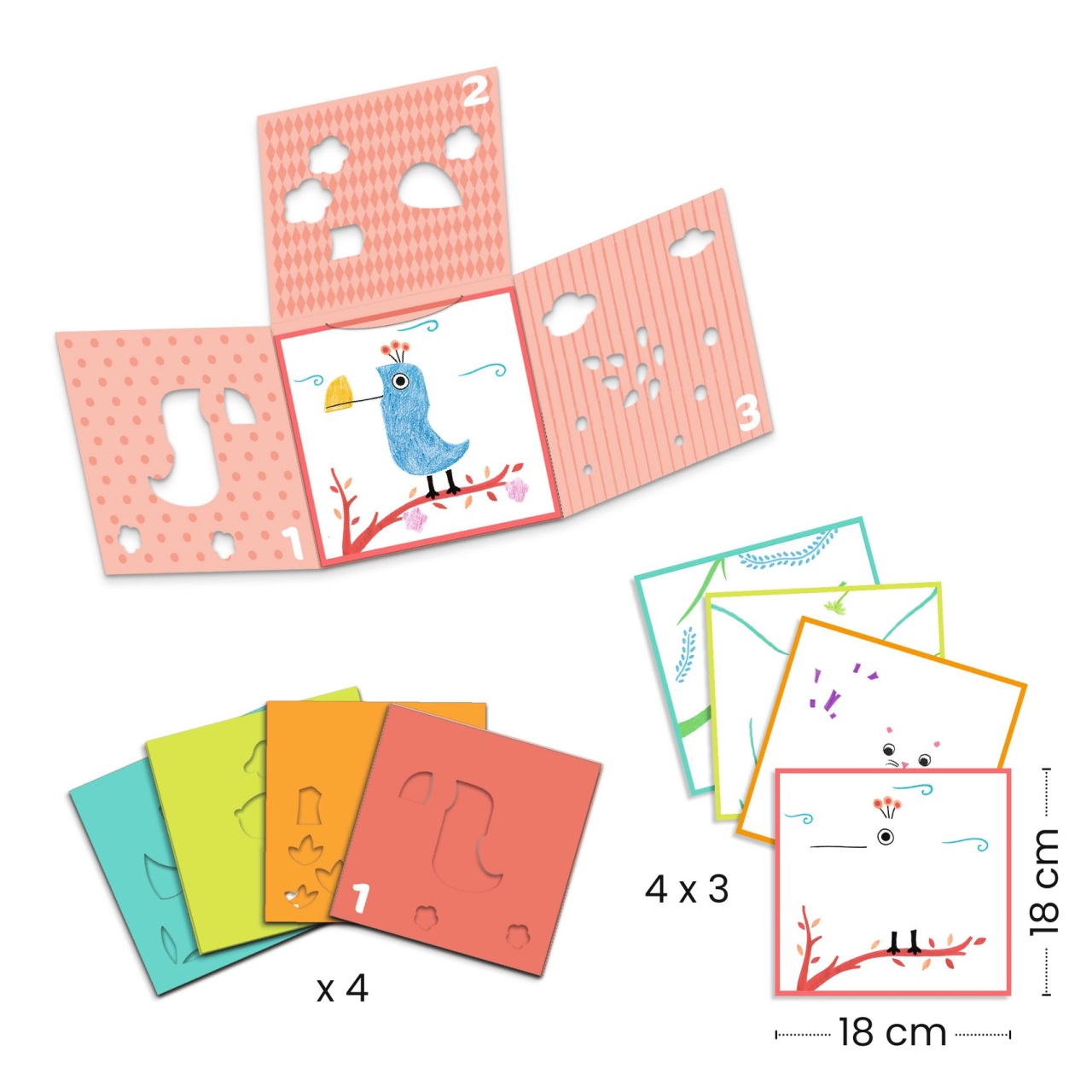Joc de desen cu sablon Copilul creează imaginea folosind un singur șablon, împărțit în 3. Introduce o planșă și pliază primul șablon. Colorează, apoi deschide și la fel procedează cu al doilea și al treilea șablon. Rezultatul final este o minunată operă de artă! O metodă originală de colorat, simplificată, adaptată pentru copii.Imaginea finală se construiește pas cu pas. Dimensiune planșă: 18 x 18 cm. Continut: 4 șabloane cu 3 clape pliabile, 12 foi imprimate pentru a fi introduse în șablon. Vârsta recomandată: +3 ani. Fabricat din hârtie și carton certificate FSC®. AVERTISMENT: Contraindicat copiilor sub 3 ani, conține piese mici, pericol de sufocare. A se utiliza sub directa supraveghere a unui adult. Producător: Djeco, Franța.