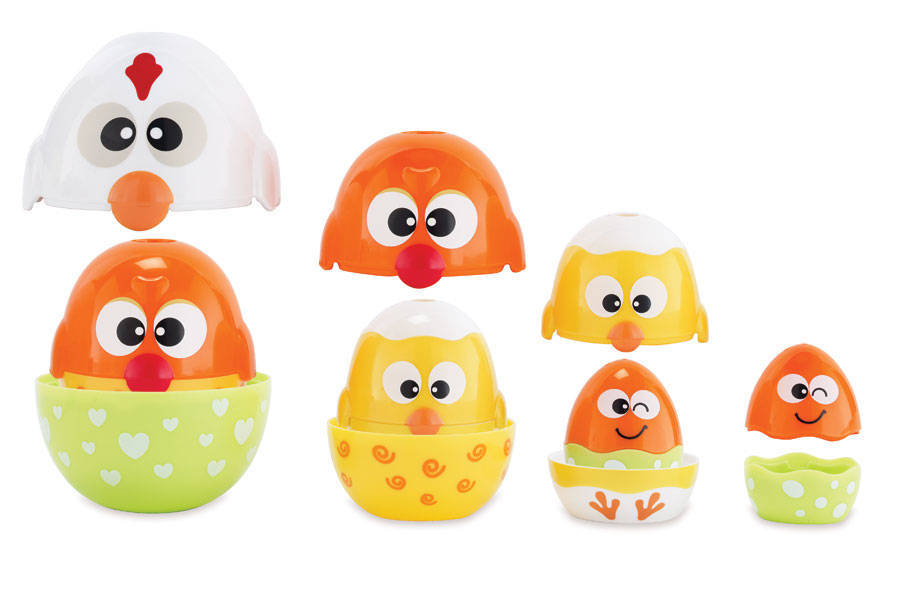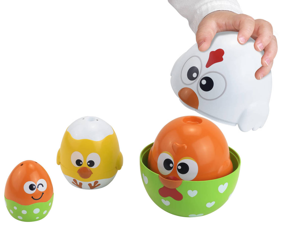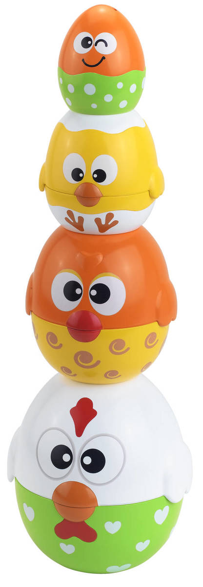 Puiutii veseli vor deveni foarte repede preferatii micutului tau! Desfacand puiutii si potrivindu-i unul in altul sau unul peste altul copilasul va invata notiuni precum mai mic si mai mare, va invata sa numere si sa identifice culori. In plus, se va distra pe cinste cand va descoperi simpaticul ousor ascuns in ultimul puiut. Pentru un joc si mai palpitant puteti ascunde diferite obiecte in cele 4 piese de joc si apoi sa ii puneti pe copilasi sa le caute.