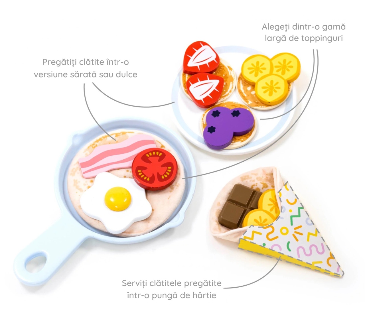 Joc de rol Set de preparat clătite, UMU Toys Un set complet pentru micii maeștri ai clătitelor! Acest joc de rol îi ajută pe copii să-și dezvolte imaginația și abilitățile motorii fine în timp ce pregătesc clătite dulci sau sărate. De la amestecarea aluatului până la servirea clătitei în punga decorativă, fiecare pas este o ocazie de joacă educativă. Copiii pot alege dintre o mulțime de toppinguri colorate – ou, banană, roșii, bacon, afine, ciocolată sau gem – și pot crea combinații originale. Gătitul devine astfel un exercițiu de creativitate și autonomie. Cine comandă azi clătite cu afine și ou prăjit? Setul include ustensile realiste precum tel, spatulă și tigaie, dar și ingrediente de jucărie fabricate cu grijă, pentru a imita perfect o experiență autentică. Învățarea prin joc devine savuroasă, iar copilul va înțelege ce înseamnă planificarea, împărțirea porțiilor și bucuria de a împărți cu ceilalți. Ideal pentru jocuri de familie, pentru socializare și învățare prin colaborare. Copiii își pot deschide propria crêperie imaginară, pot lua comenzi, pregăti porții și servi clienții. Cadoul perfect pentru zile de naștere, Crăciun sau alte ocazii speciale. Setul conține 40 de piese: tigaie, ustensile, clătite moi din material textil, mini-clătite, ingrediente și toppinguri diverse (ou, afine, roșii, banane, bacon, ciocolată, gem), bol, platou, farfurie, pahar, cutie cu făină, meniu decorativ crêperie, punga pentru servire, sticlă de lapte și multe altele – toate cu margini netede și sigure pentru copii. Vârsta recomandată: +3 ani Confecționat din lemn și textile cu vopsele ecologice pe bază de apă. Conform EN71 & ASTM, cu certificare CE AVERTISMENT: Contraindicat copiilor sub 3 ani. Se recomandă supravegherea copilului în timpul jocului. Produs în China pentru UMU Toys, Cehia.
