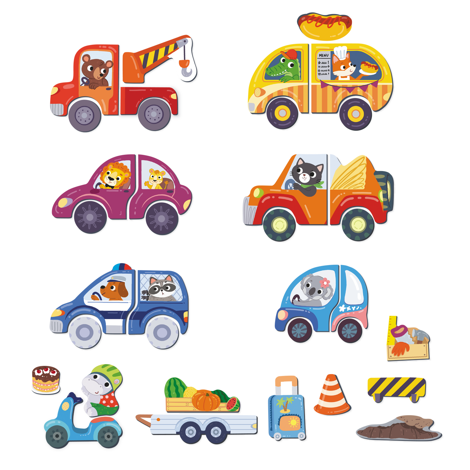 36 magneti cu diferite vehicule, obstacole, semafor etc.
