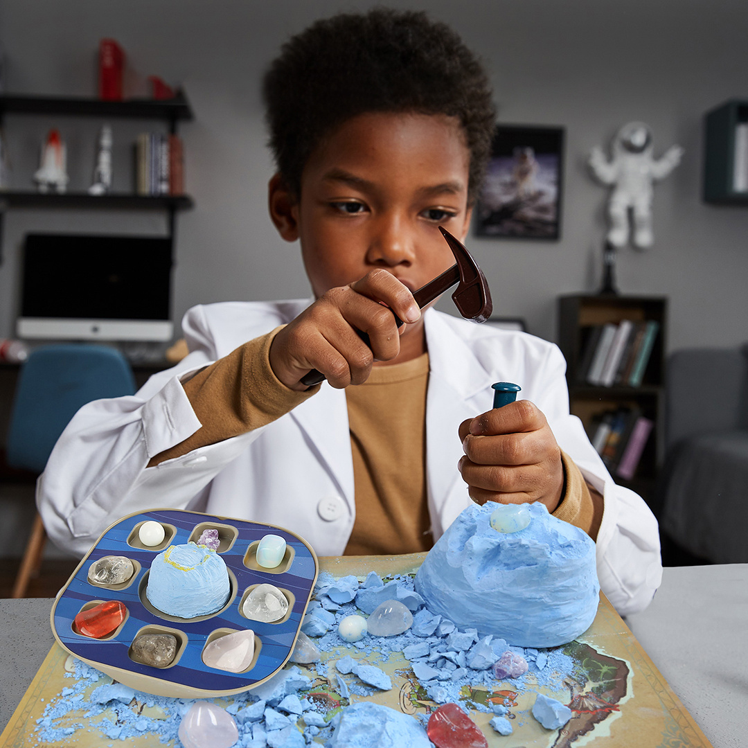 Kit STEM de excavare pietre prețioase din „Marea gaură albastră” Belize Copiii pornesc la o vânătoare de comori cu setul de excavare a pietrelor prețioase din Belize. Ei sapă ca niște adevărați geologi și descoperă pietrele prețioase fantastice ascunse înăuntru. Bucată cu bucată, înlătură bucăți de stâncă în căutarea pietrelor prețioase. În acest proces, ei își extind cunoștințele despre formațiunile geologice și înțeleg efectele excavațiilor. Stârnește-le curiozitatea și aprinde-le simțul aventurii cu setul de excavare și creează o experiență de neuitat pentru tinerii exploratori. Copiii folosesc unelte de minerit realiste, cum ar fi ciocan și daltă, pentru a săpa cu atenție prin rocă și a căuta pietrele prețioase. Ei dezgroapă pietre prețioase, analizează culoarea, transparența și strălucirea acestora și își documentează descoperirile. După ce au găsit toate cele opt pietre prețioase, își pot prezenta colecția de pietre prețioase pe reverul bazei pe care îl vor folosi drept suport Conține 2 blocuri de excavare de dimensiuni diferite, soclu, ciocan, daltă, pensulă, recipient cu pulverizator, 8 pietre prețioase, harta minunilor lumii. Vârsta recomandată: +6 ani. Conform reglementarilor EN71&ASTM.AVERTISMENT: Contraindicat copiilor sub 3 ani, conține piese mici. Se recomandă supravegherea copilului de către un adult în timpul jocului. Citiți instrucțiunile înainte de utilizare, urmați-le și păstrați-le pentru referință.Produs in China de TopBright Wisdom Information Technology pentru Topbright Gmbh, Germania Manual Kit STEM de excavare pietre prețioase din „Marea gaură albastră” Belize – descarca aici fisierul