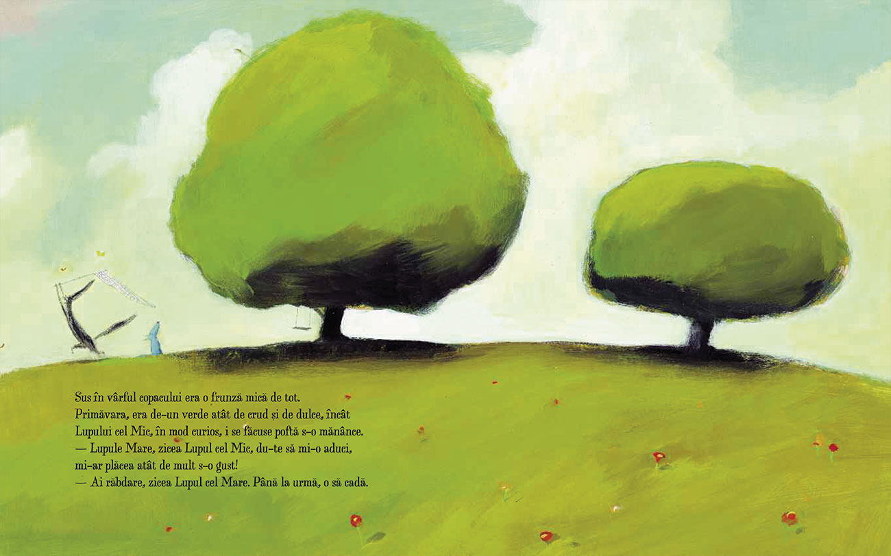 Sus în vârful copacului se află o frunză mică de tot. Lupul cel Mic își dorește foarte tare s-o privească de aproape, s-o mângâie, ba chiar s-o mănânce. Cum să ajungi la o frunzuliță care nu vrea să cadă singură din copac?