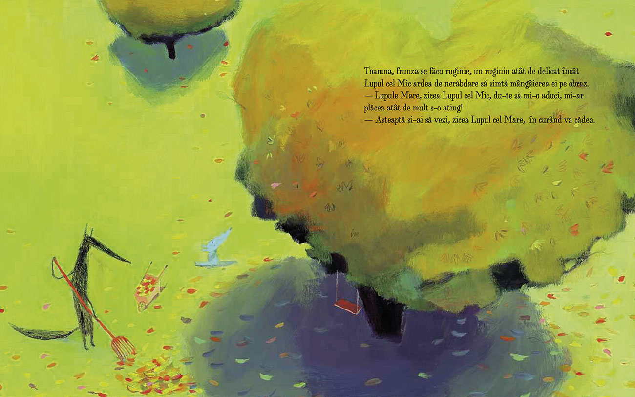 Lupul cel Mic nu spunea nimic. Nici nu mai zâmbea. Începu să se întrebe dacă avea rost o asemenea strădanie pentru o frunză atât de mică.(traducere de Lavinia Braniște)