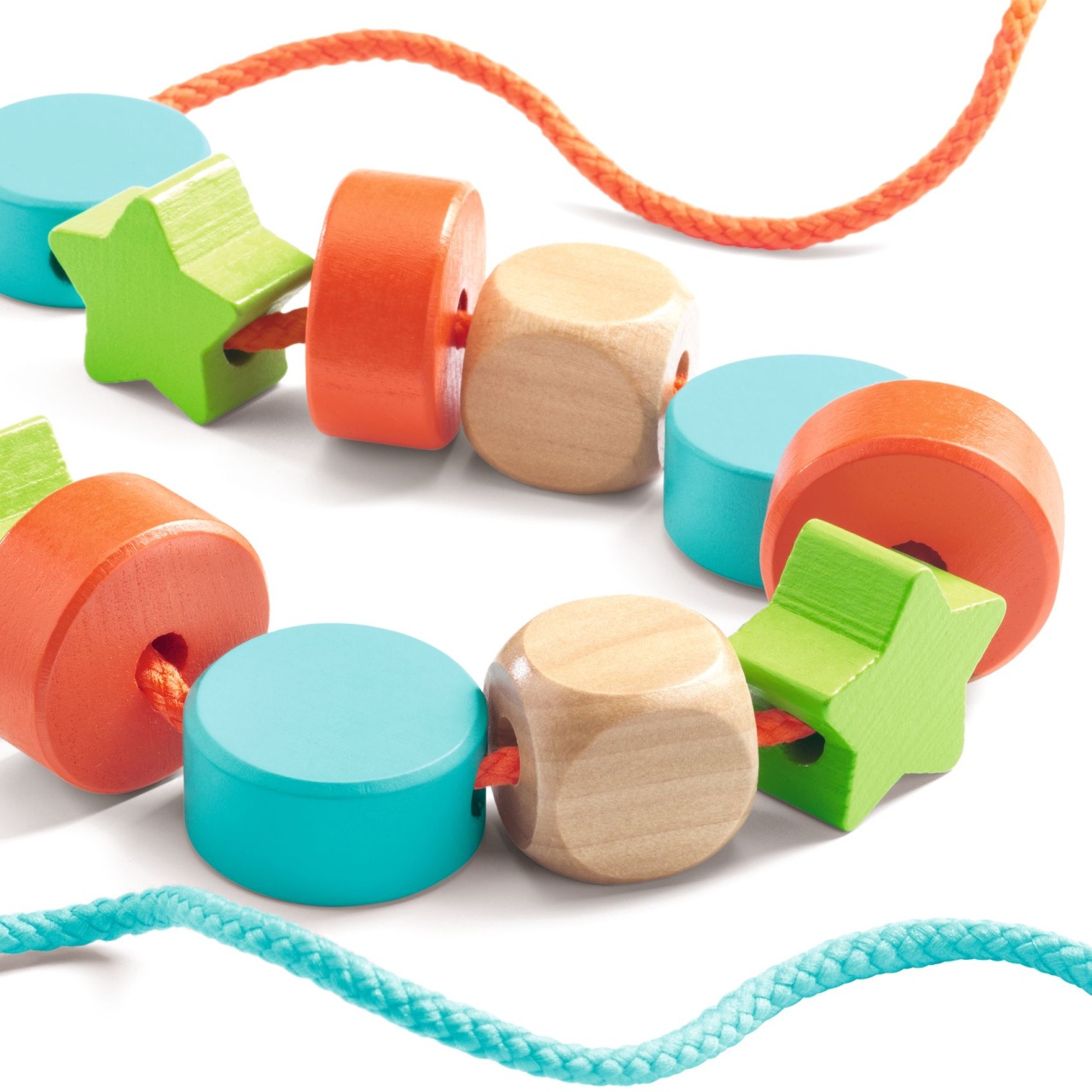 Mărgele de înșirat din lemn Mărgele din lemn mari si colorate, de înșirat. Copiii se distrează înșirând mărgele de diferite forme pe cele două șireturi colorate și lasându-și imaginația liberă. Ajută la dezvoltarea abilităților motorii fine ale copiilor, ei învățând și despre forme și culori. Continut: 24 margele din lemn – stele, cercuri și pătrate în diferite culori si 2 șireturi. Dimensiune aproximativa a pieselor: 2.5 cm cubul; 3 cm steaua; 3 cm cercul. Vârsta recomandată: +2 ani. Confecționat din lemn și textil, cu vopsele non-toxice, conform reglementărilor EN71 & ASTM Avertisment, conţine şnur, contraindicat copiilor mai mici de 2 ani. A se utiliza sub atenta supraveghere a unui adult. Producător: Djeco, Franța