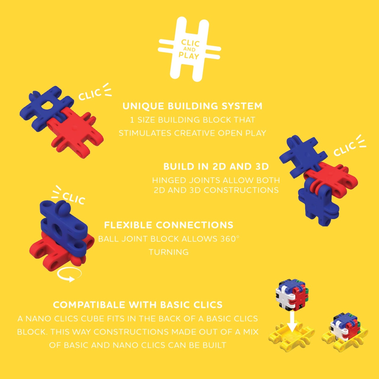 Nano Clics Pentru construit vehicule 250 piese Mai multă creativitate într-un pachet mai mic! Cu aceast set de construcție inovator și premiat, Clics invita o nouă generație de constructori să experimenteze lumea imaginativă a jocului de construcție. Seturile versatile au un sistem unic de clicuri, permițând construirea rapidă și ușoară, garantând ore întregi de distracție. Toate piesele se potrivesc perfect, pentru posibilități nelimitate. Ai chef de o nouă construcție? Nicio problemă, dezasamblezi construcția și o iei de la început. Amuzant, creativ și educativ. Nano Clics este conceput pentru a stimula în aceeași măsură imaginația copiilor dar și a adulților. Cadoul ideal pentru Crăciun sau zile de naștere. Diferitele seturi Nano Clics pot fi combinate între ele și extinse după dorință, astfel încât nu există limite pentru jocul creativ.Conține 250 de piese. Fabricat în Belgia din plastic și carton reciclat. Conform standardelor EN71. Vârsta recomandată + 8 ani. AVERTISMENT: Contraindicat copiilor sub 3 ani. Conține piese mici. A se utiliza sub directa supraveghere a unui adult.