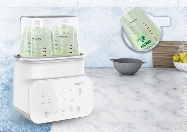 Datorită funcției integrate de decongelare, poți dezgheța cu ușurință laptele pe care l-ai pregătit pentru micuțul tău, folosind punguțele speciale Neno. Tot ce trebuie să faci este să introduci punguța congelată în recipient și să selectezi opțiunea de decongelare de pe panoul de control.