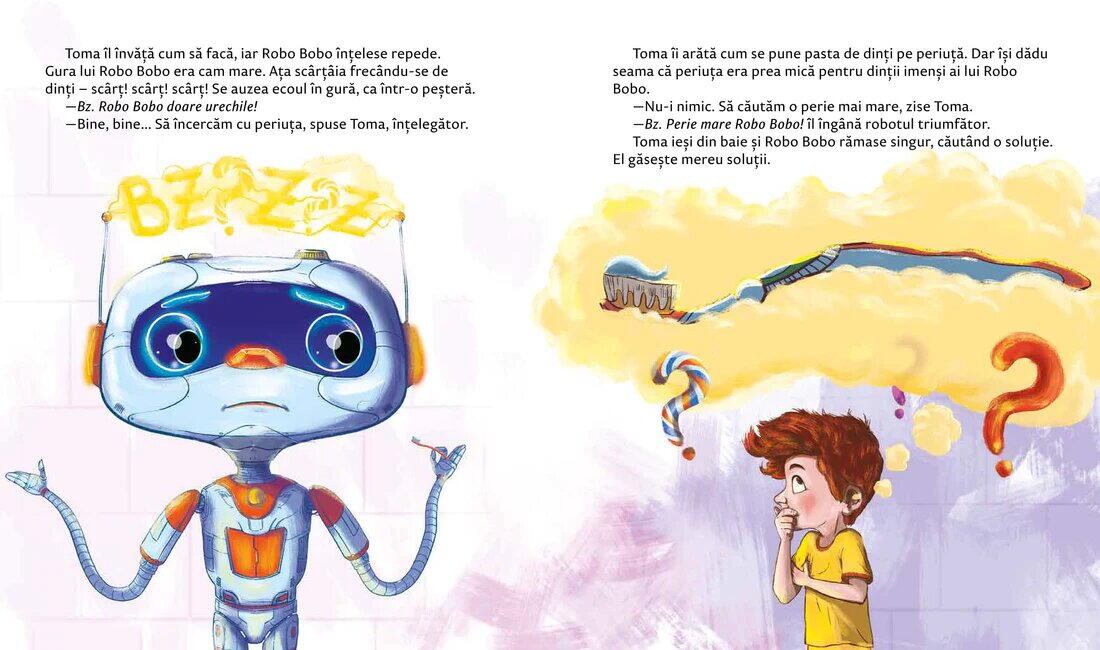 Robo Bobo este cadoul primit de un baietel de ziua lui. Este un robot de doua ori mai inalt decat copilul. Si parca tot de doua ori mai obraznic si mai pus pe sotii. Copilul trebuie sa-l invete sa se poarte ca un om. Prima lectie: spalatul pe dinti. Usor, nu? Toti copiii stiu sa se spele pe dinti, dar Robo Bobo face atatea greseli incat se sperie si pisica, si ariciul.Oare invata pana la urma? Atentie la sertarasul lui secret!
