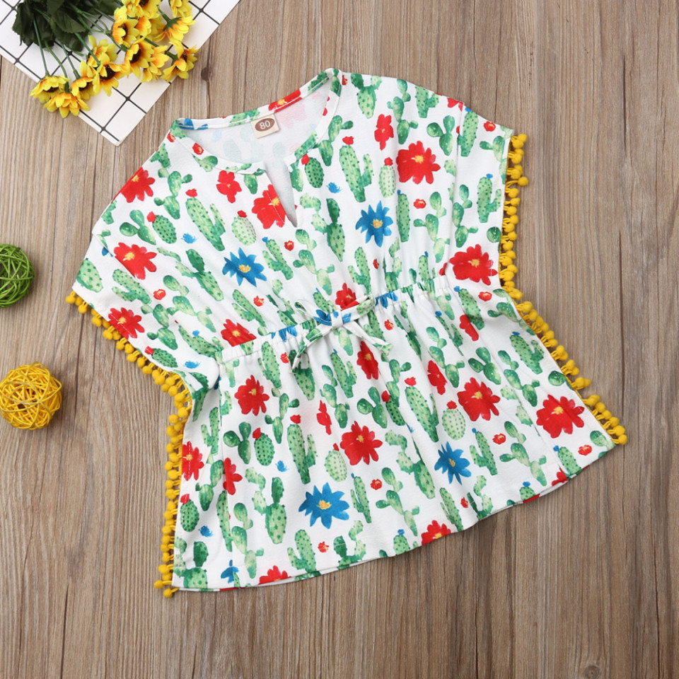 Rochie de plaja cu imprimeu exotic si atragator pentru fetite, cu rascroiala ampla la maneci si cu maneci scurte.