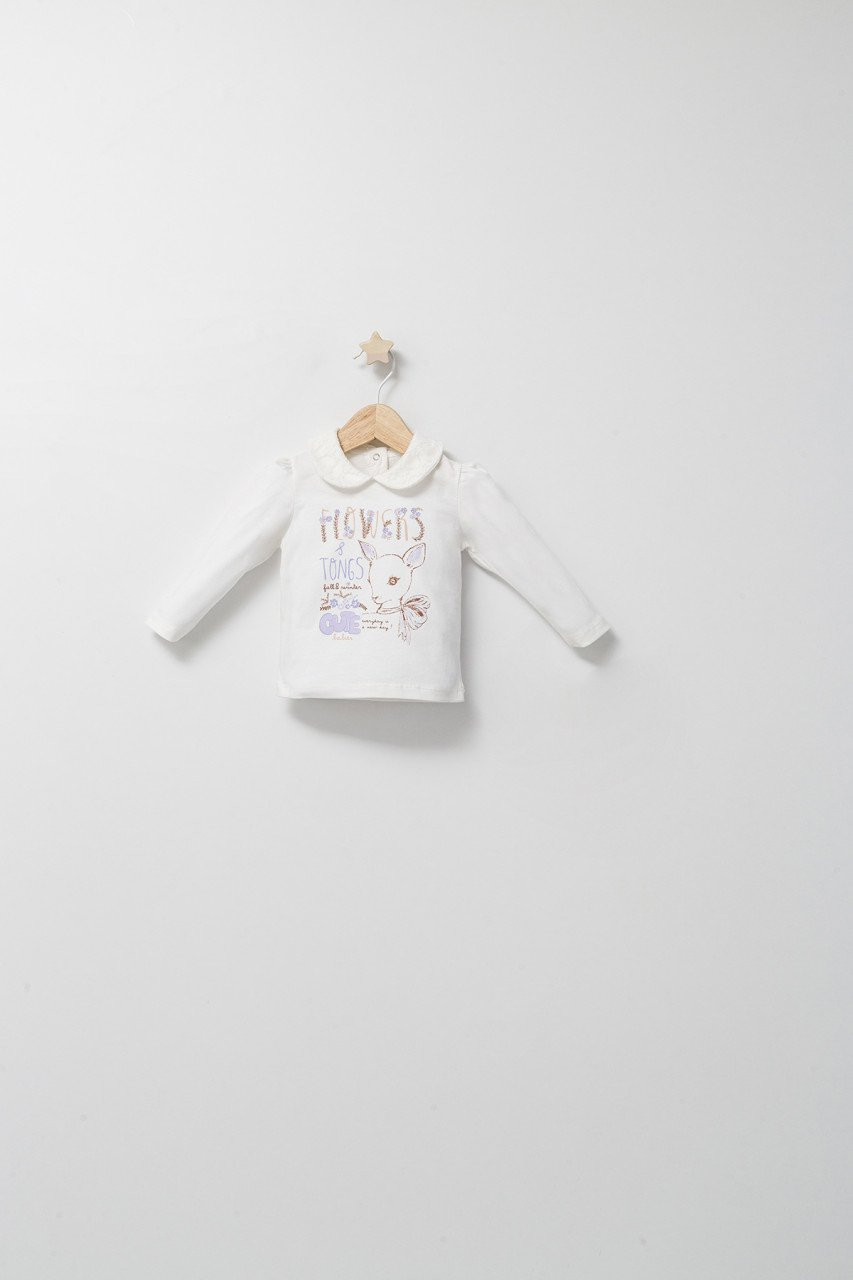 – bluzita din bumbac cu guleras, cu imprimeu haios cu caprioara. Aceasta se inchide cu capsa in partea superioara la spate.