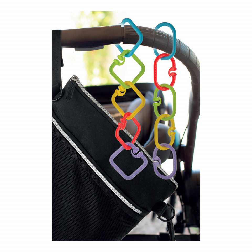 – Inelele pot fi utilizate,de asemenea,pentru a agata jucariile de carucior,scoica,salteluat de joaca,etc.