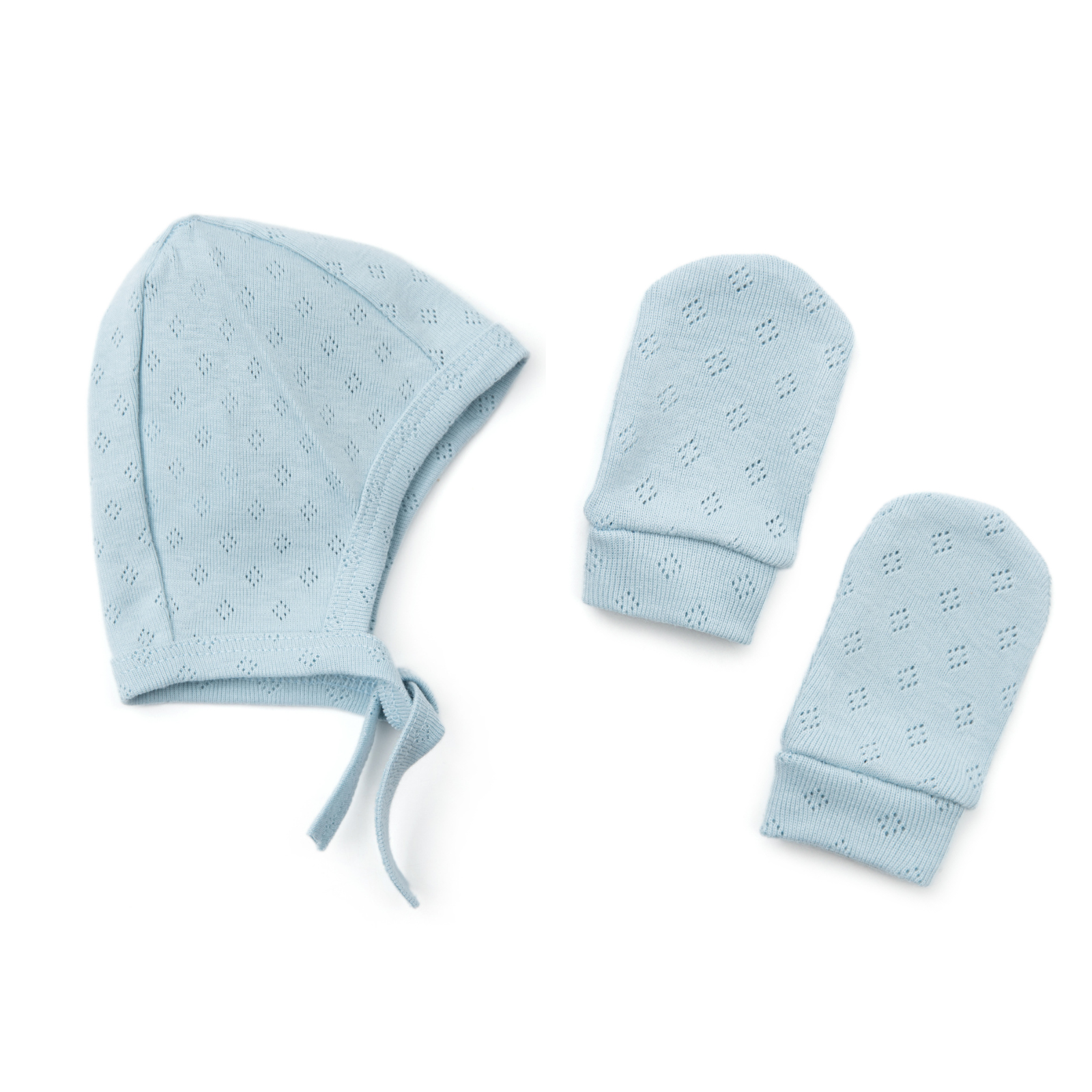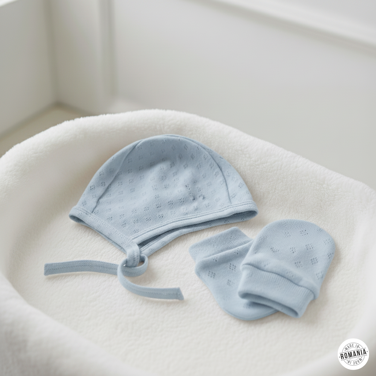 Setul caciulita boneta + manusi este esential pentru primele saptamani! Confectionat din bumbac 100% hipoalergenic.
