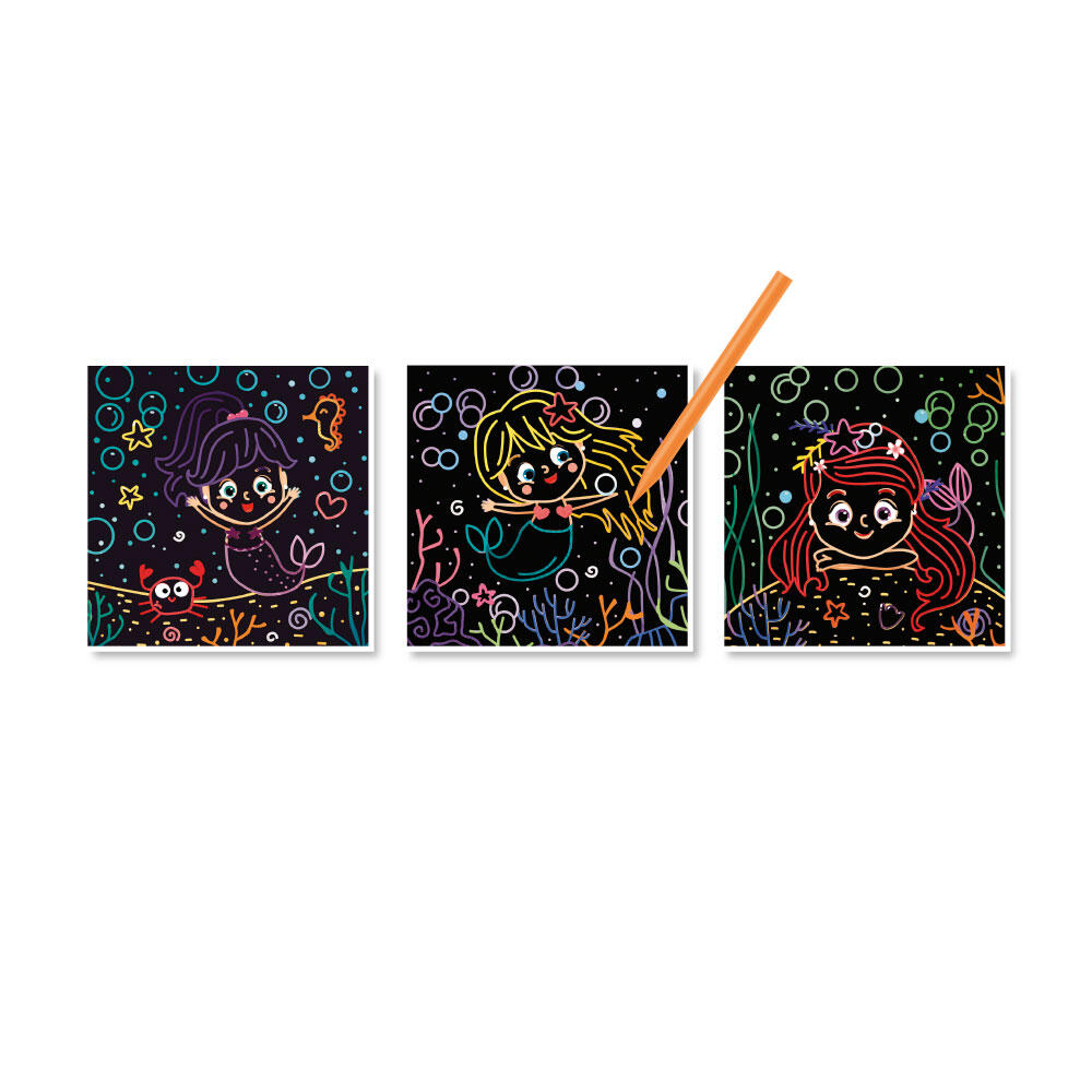 plansele au un invelis magic care o data ce este razuit cu betisorul special va lasa sa iasa la suprafata culorile splendide si in final vei obtine 3 imagini minunate cu sirene viu colorate