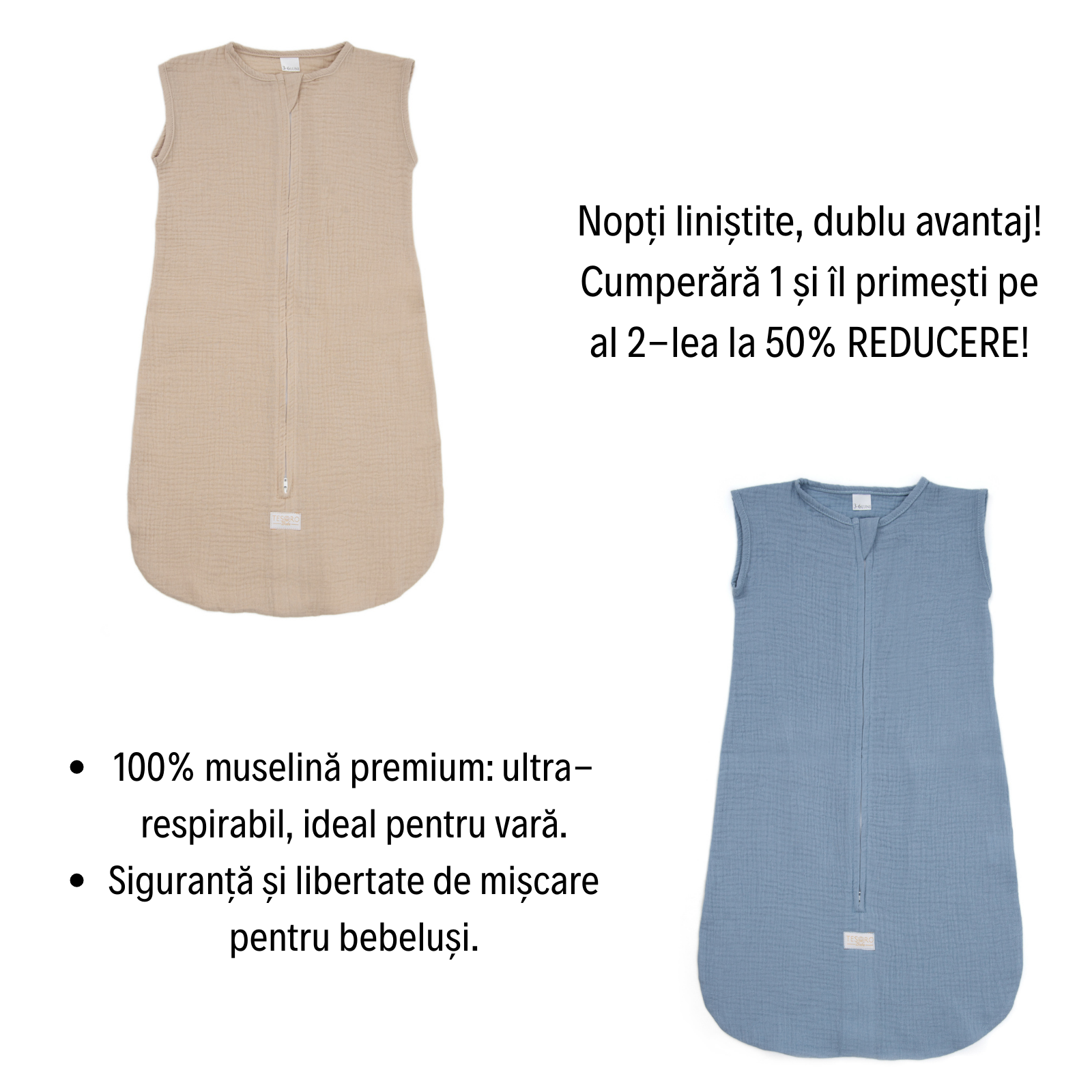 Sacul nostru de dormit este confectionat din muselina premium 100% bumbac, un material recunoscut pentru finetea si respirabilitatea sa exceptionala. Tesatura este incredibil de fina si catifelata la atingere, fiind perfecta pentru a fi purtata direct pe pielea sensibila a bebelusului. Ne-am asigurat ca materialul este certificat si absolut fara substante nocive, oferind liniste parintilor ca micutul lor este in siguranta si protejat. Aceasta compozitie naturala permite pielii sa respire, prevenind transpiratia excesiva si asigurand un mediu uscat si confortabil.