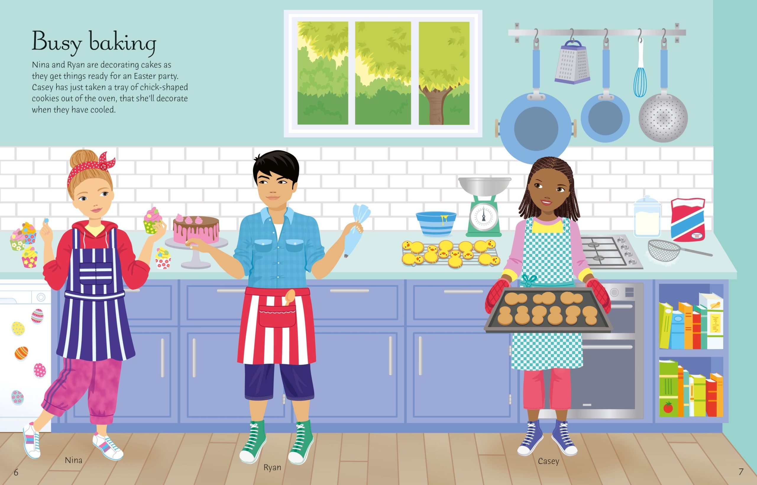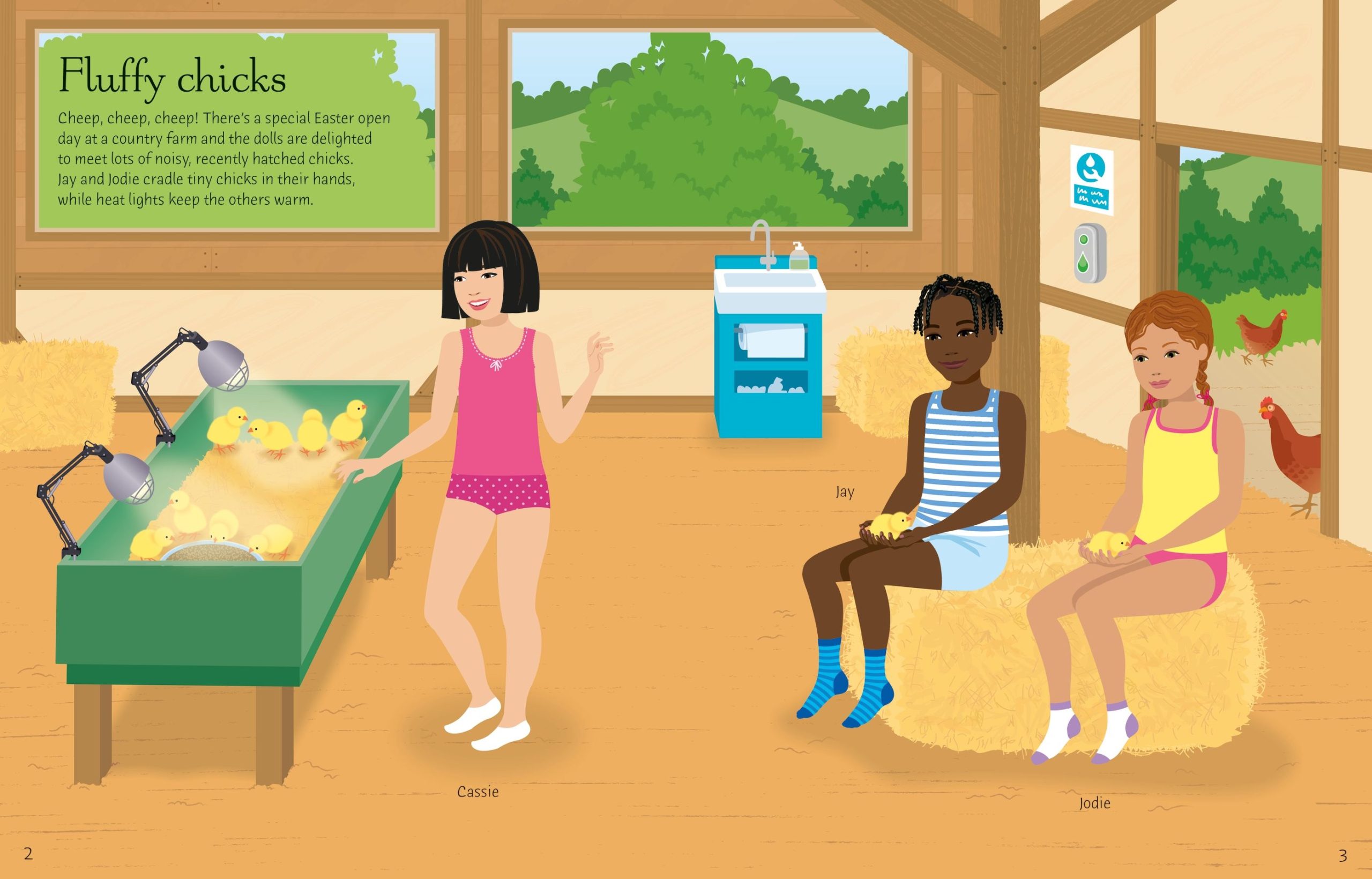 Distrează-te alegând autocolantele pentru a crea ținute pentru păpuși în timp ce merg la o vânătoare de ouă de Paște, hrănesc miei nou-născuți înfometați, decorează ouă, plantează flori de primăvară și se ocupă de puii de o zi.