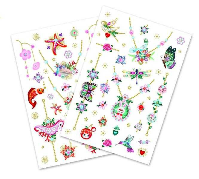Tatuaje Bijuterii Două foi de tatuaje temporare cu bijuterii cu tematică marină – sirene frumoase în lumea lor subacvatică. Copiii vor adora aceste tatuaje, completate cu detalii aurii.Aceste tatuaje temporare sunt pre-tăiate pentru a le face ușor de utilizat și transferat folosind puțină apă. Se aplică tatuajul pe pielea uscată, se umezește pelicula și se apasă câteva secunde. Testate dermatologic. Conținut: 2 foi de tatuaje temporare care strălucesc în întuneric și 1 set de instrucțiuni. Vârsta recomandată: +3 ani. Confecționate din materiale și culori non-toxice. Certificate FSC®. AVERTISMENT: Contraindicat copiilor sub 3 ani. A se utiliza sub directa supraveghere a unei persoane adulte. Producator: Djeco, Franța