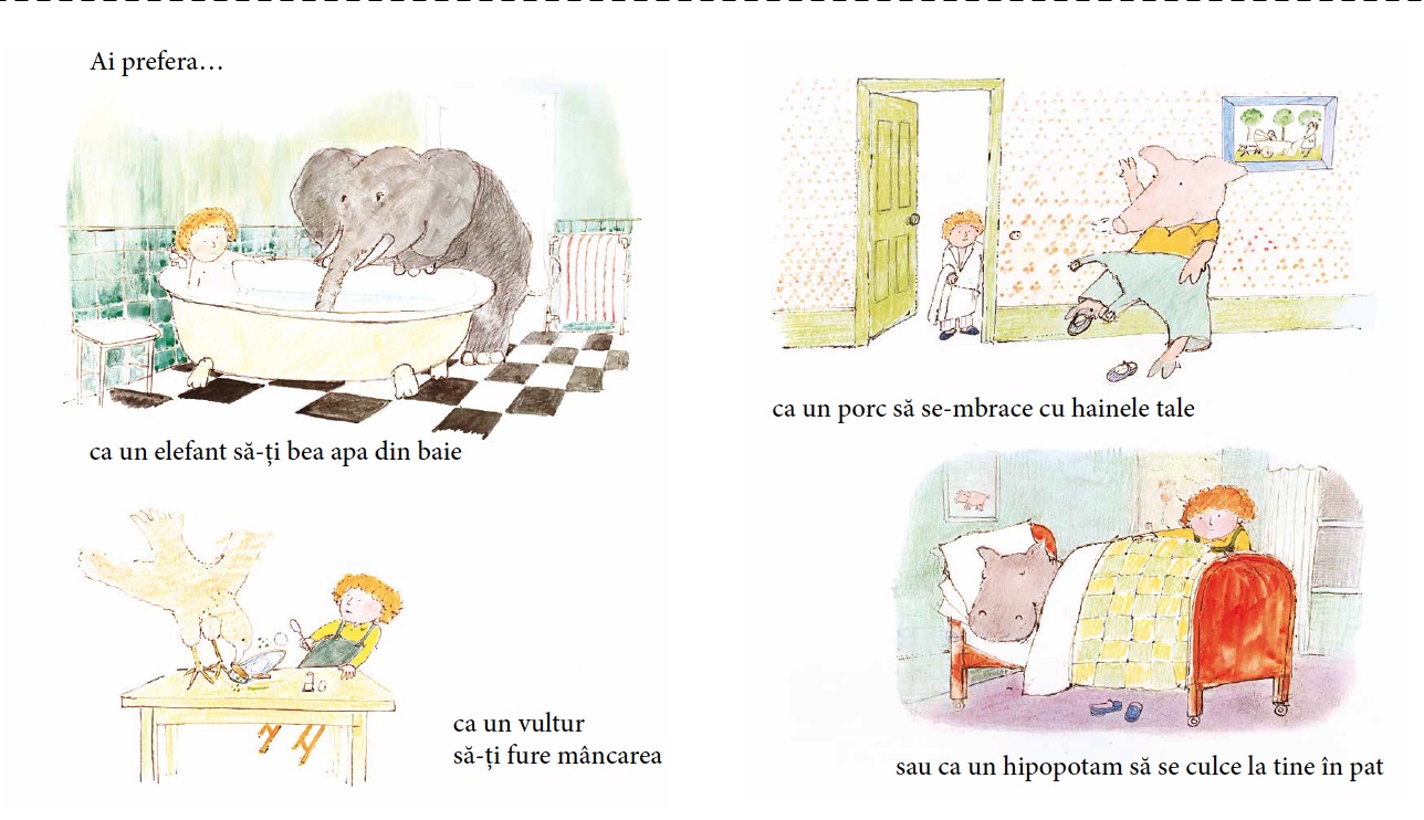 O lectură interactivă, cu o mulțime de scenarii neobișnuite, care încurajează conversația, stimulând curiozitatea și simțul umorului. Un clasic care a rezistat de-a lungul anilor și o lectură minunată de împărtășit împreună iar și iar.