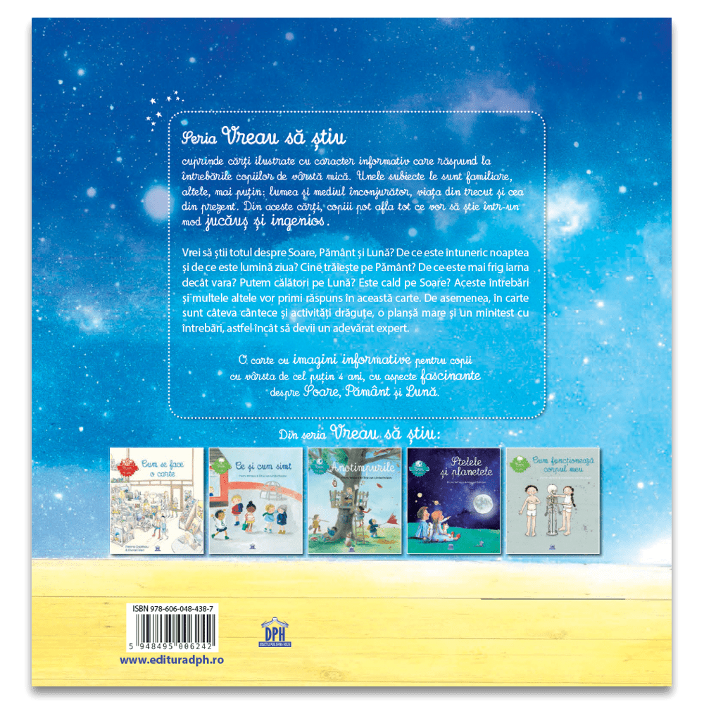 Noua carte din seria DPH -Vreau sa stiu cuprinde numeroase raspunsuri la multe intrebari precum: ”Vrei sa stii totul despre Soare, Pamant si Luna?”, ”De ce este intuneric noaptea si de ce este lumina ziua?”, ”Cine traieste pe Pamant?”, ”De ce este mai frig iarna decat vara?”, ”Putem calatori pe Luna?”, ”Este cald pe Soare?”.